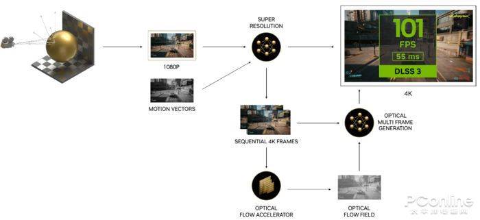 想实现DLSS帧生成可不简单,这需要配合上Ada Lovelace架构的GeForce RTX 40系列显卡才行。DLSS帧生成技术原理是:利用AI技术生成更多帧,以此提升性能。DLSS会借助 GeForce RTX 40系列GPU所搭载的全新光流加速器分析连续帧和运动数据,进而创建其他高质量帧,同时不会影响图像质量和响应速度。