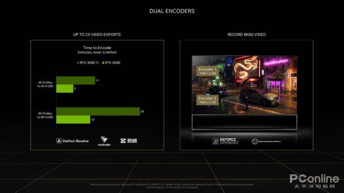 GeForce RTX 40系列显卡还有一个全新的升级,那就是编码器NVENC。第八代的NVENC编码器不仅支持H.264与H.265,还支持开放式视频编码格式 AV1。