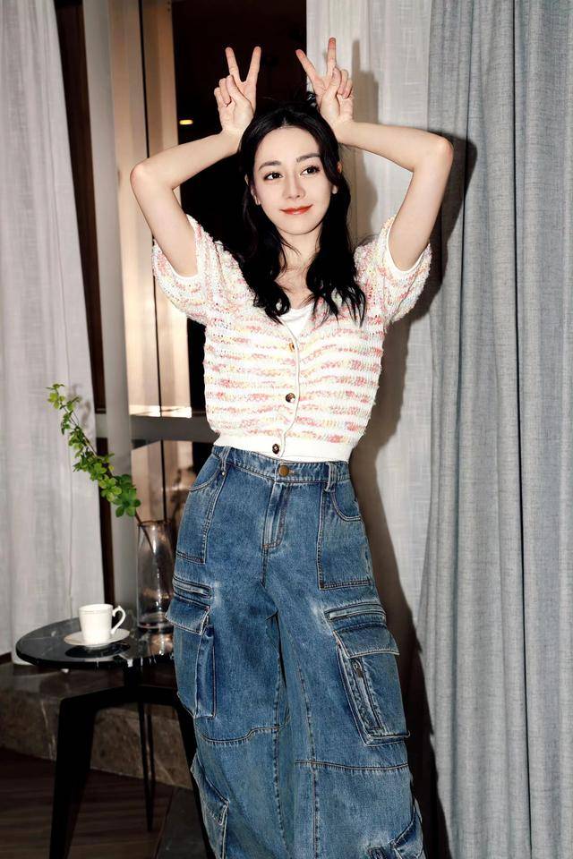 — 迪丽热巴穿着条纹针织开衫和牛仔工装裤,打造甜美又酷炫的家居风格大片 —