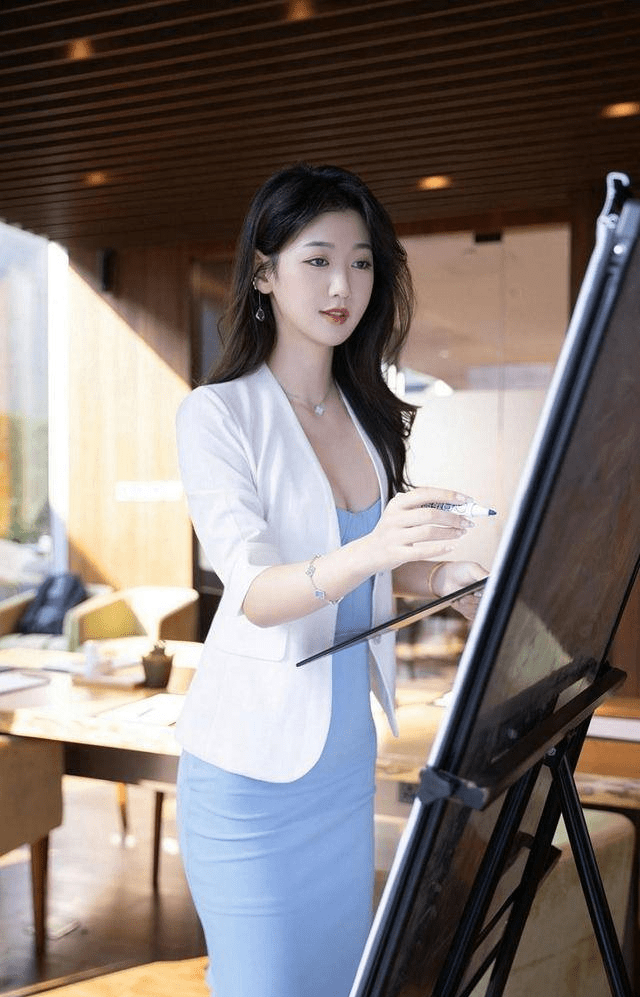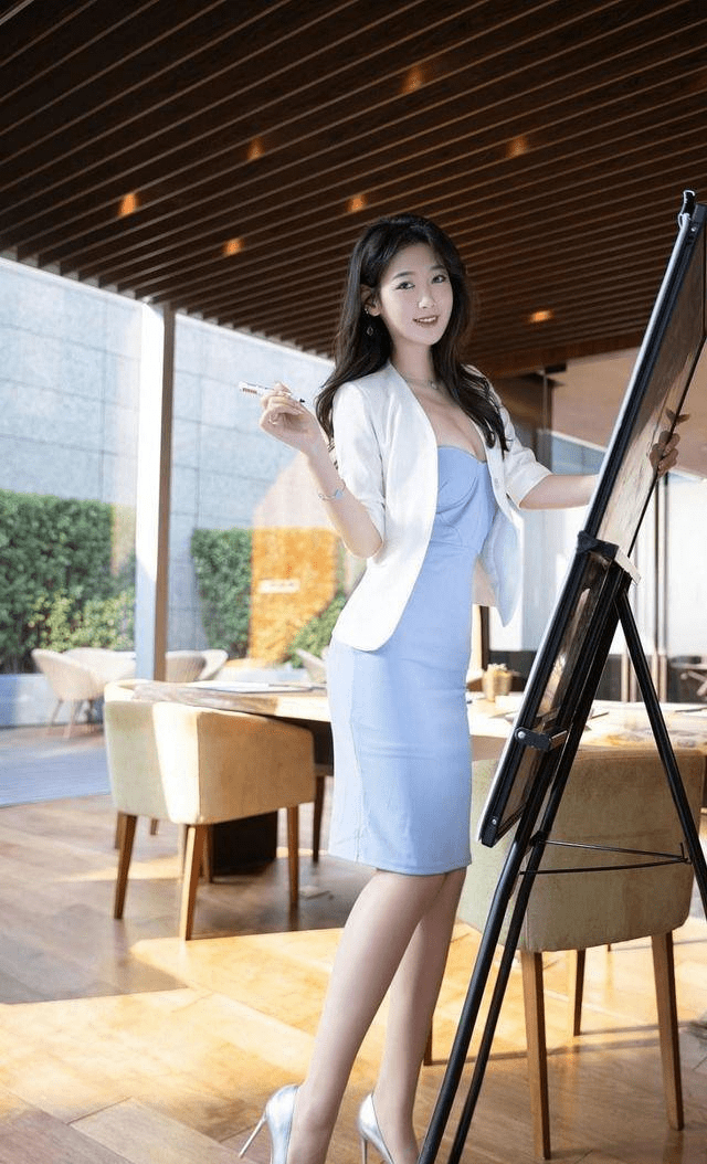— 通勤装备:淡蓝色衬衫、同色系半身裙和黑丝高跟鞋 —