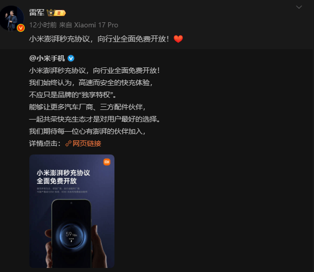 — 小米宣布澎湃秒充协议向行业免费开放 —