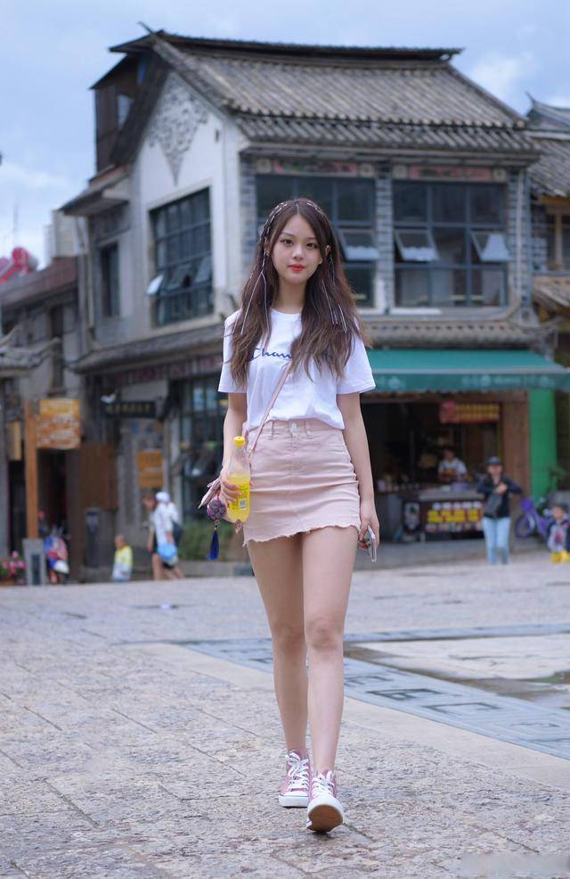 — 清新活力:白色T恤配粉色紧身牛仔短裙及帆布鞋 —
