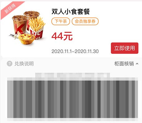 下午茶 双人小食(薯条+蛋挞+拿铁)套餐 2020年11月凭肯德基优惠券44元