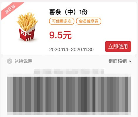 薯条(中)1份 2020年11月凭肯德基优惠券9.5元