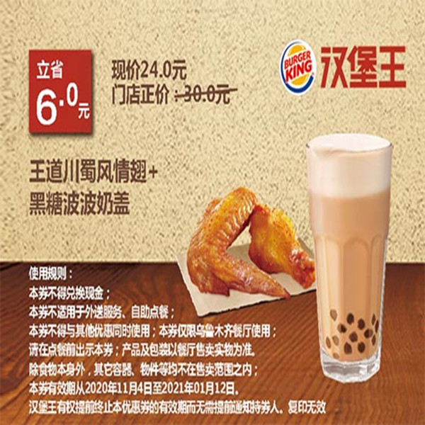 乌市汉堡王 王道川蜀风情翅+黑糖波波奶盖 2020年11月12月2021年1月凭券优惠价24元