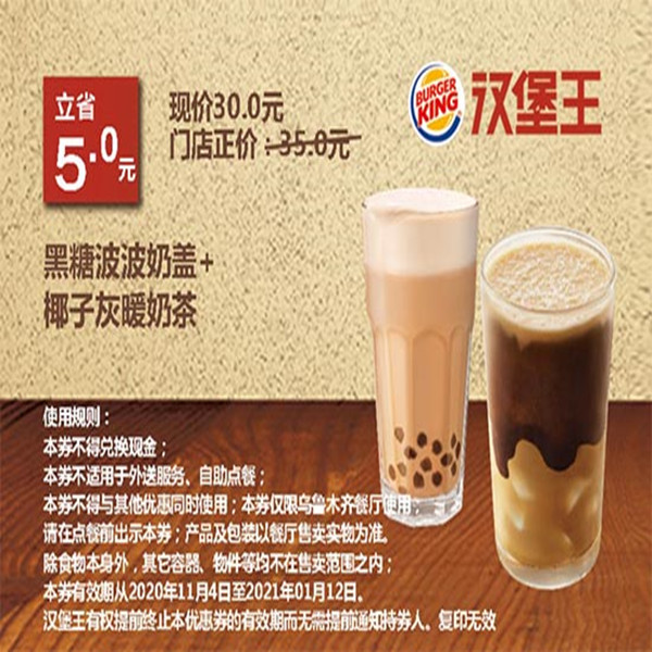 乌市汉堡王 黑糖波波奶盖+椰子灰暖奶茶 2020年11月12月2021年1月凭券优惠价30元