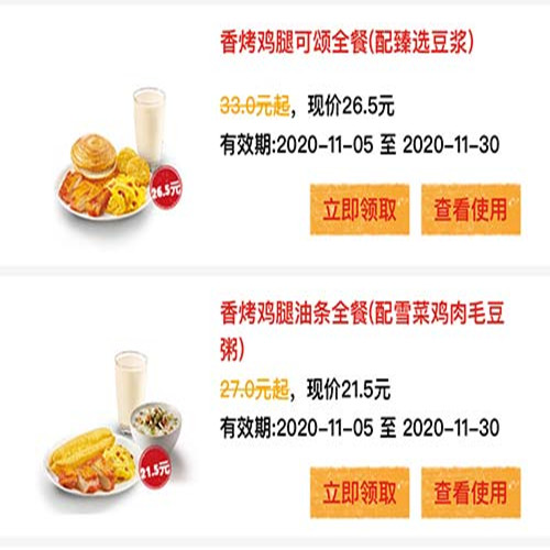 优 惠 额:11月香烤鸡腿可颂全餐26.5元 油条全餐21.5元