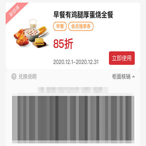 早餐 有鸡腿厚蛋烧全餐 2020年12月凭肯德基优惠券85折