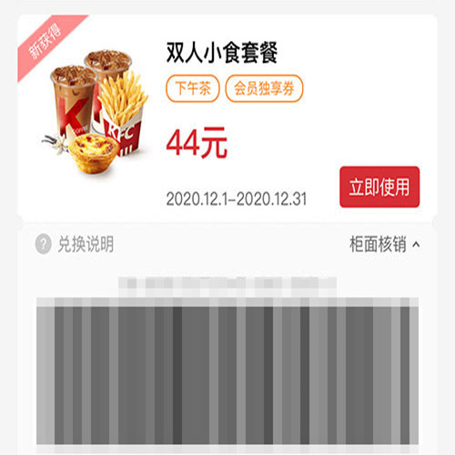 下午茶 2人小食套餐 薯条+蛋挞+拿铁+风味拿铁 2020年12月凭肯德基优惠券44元