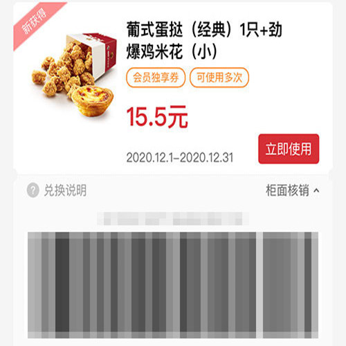 葡式蛋挞(经典)1只+劲爆鸡米花(小) 2020年12月凭肯德基优惠券15.5元