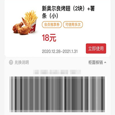 新奥尔良烤翅2块+薯条(小) 2021年1月凭肯德基优惠券18元