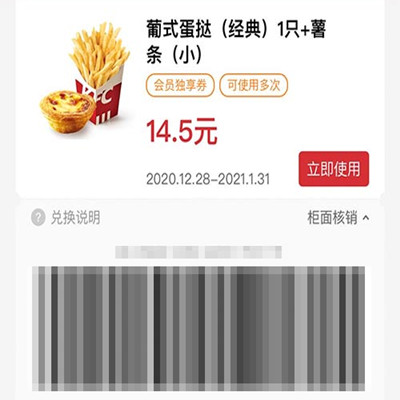 葡式蛋挞(经典)1只+薯条(小) 2021年1月凭肯德基优惠券14.5元
