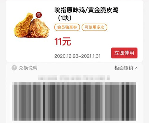 吮指原味鸡/黄金脆皮鸡1块 2021年1月凭肯德基优惠券11元