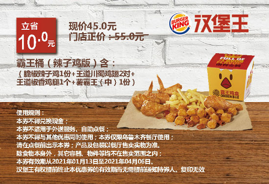 乌市汉堡王 霸王桶(辣子鸡版) 2021年1月-4月凭优惠券45元