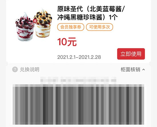 原味圣代(北美蓝莓酱/冲绳黑糖珍珠酱)1个 2021年2月凭肯德基优惠券10元
