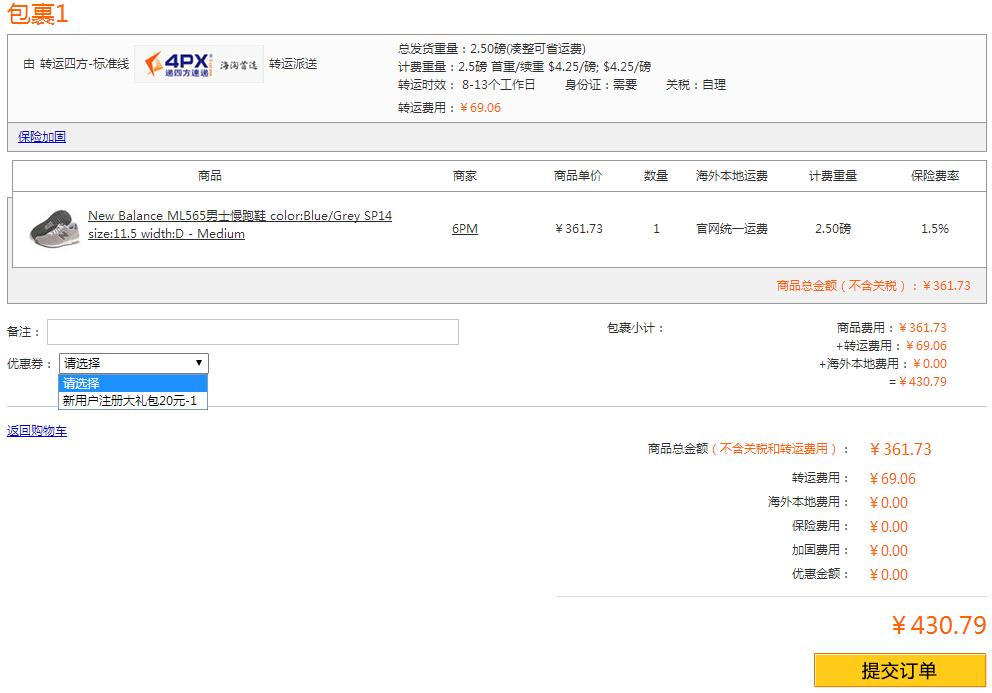 第二步:填写完地址后,选择优惠券下拉列表中可使用的优惠券。