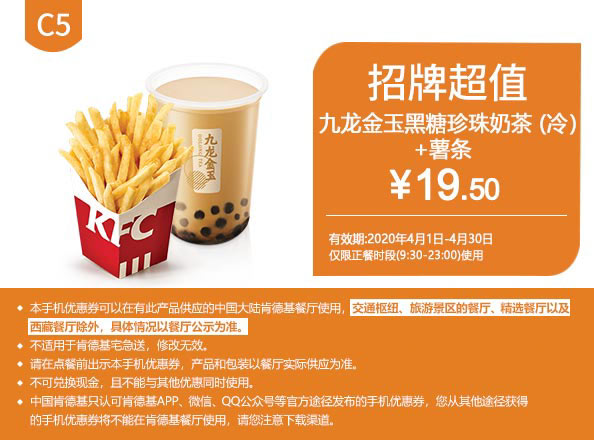 C5 九龙金玉黑糖珍珠奶茶(冷)+小薯条 2020年4月凭肯德基优惠券19.5元