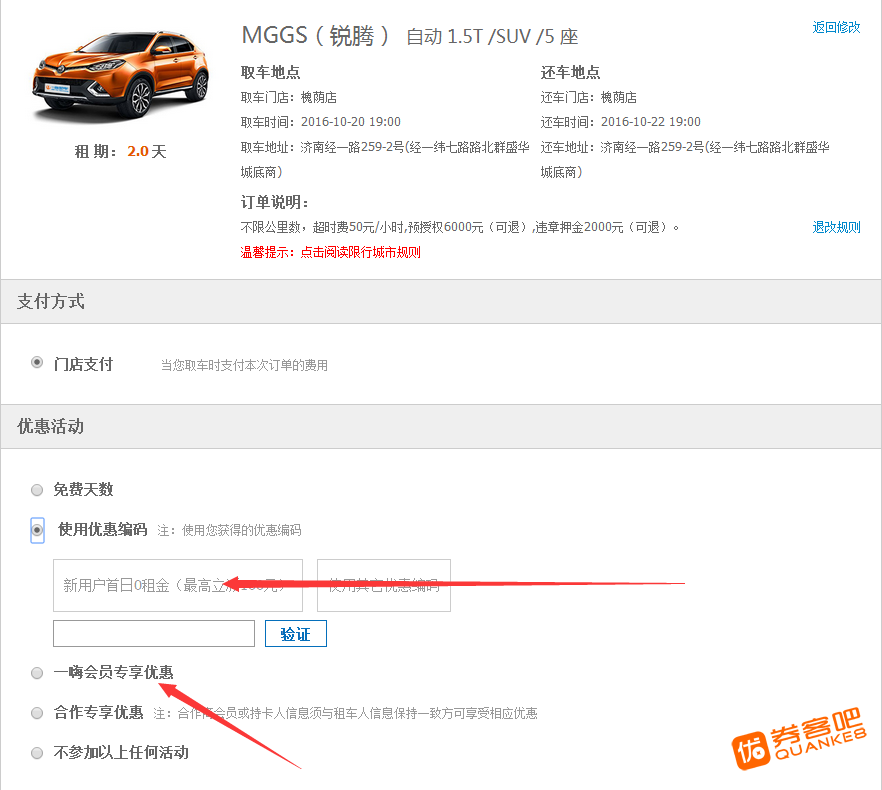 在券客吧领取一嗨租车优惠券码后,通过本站链接到一嗨租车 购物进行下单,下单进行到结算页面时,在结算页面的右下侧输入您在券客吧领取的一嗨租车 优惠券码点击立即使用即可获得立减优惠。