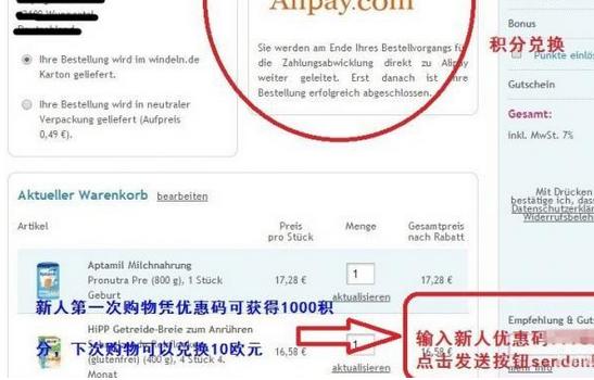 在券客吧领取Windeln优惠券码后,通过本站链接到Windeln 购物进行下单,下单进行到结算页面时,在结算页面的右下侧输入您在券客吧领取的Windeln 优惠券码点击立即使用即可获得立减优惠。1.首先访问并登陆Windeln网站2.选择您要购买的海淘商品到购物车 3.在结账页面找到可以输入Windeln优惠码的输入框,复制券客吧提供的Windeln优惠码到输入框里,点击使用即可,如下图所示: