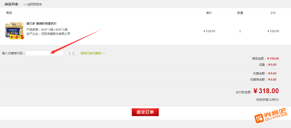 在本站领取康之家网上药店优惠券码后,通过本站链接到康之家网上药店购物进行下单,下单进行到结算页面时,在结算页面的右下侧输入您在本站领取的康之家网上药店优惠券码点击立即使用即可获得立减优惠。