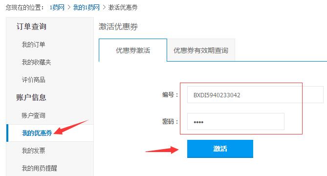 首先进入我的1药网 在账户信息下面点击我在优惠券 然后激活优惠券;然后在输入本站领取的优惠劵编号和密码 点击激活就可以在下面看到兑换成功的优惠券了;选购产品进入支付页面选择优惠券支付即可获得立减优惠!
