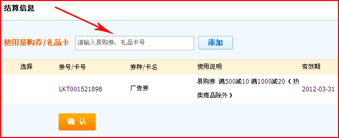 1、注册成为丁丁打折网(www.dddazhe.cn)会员领取苏宁易购优惠券。2、选购好商品后,进入结算流程,在“确认订单信息”中找到“结算信息-使用易购券/礼品卡”,输入号码后提交订单就能享受优惠了: