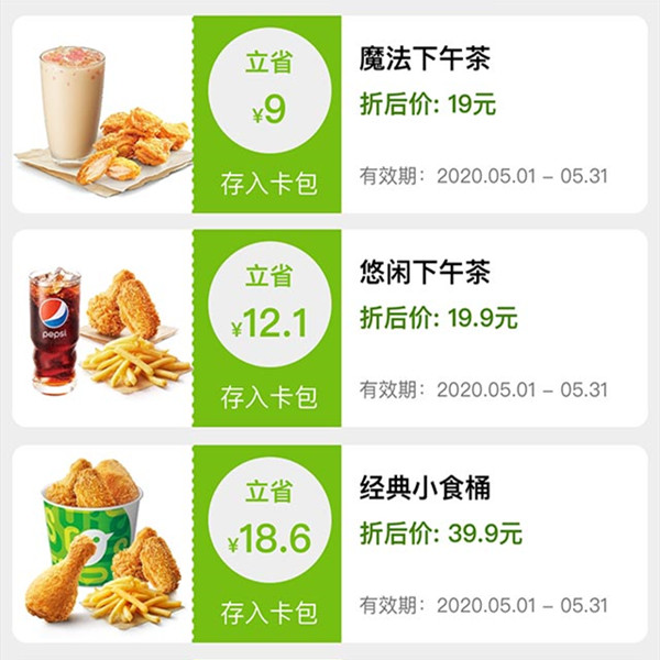 德克士套餐优惠券2020年5月下午茶套餐19元起,小食套餐26.9元起
