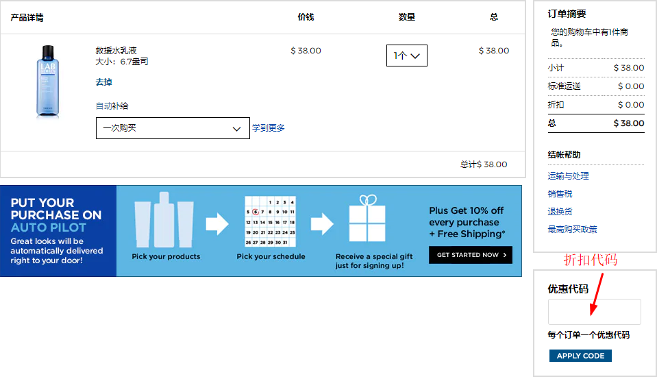 1、注册成为丁丁打折网(www.dddazhe.cn)会员,领取Lab Series(朗仕)优惠码。2、注册并登陆Lab Series(朗仕)官网,选购您喜欢的商品进入购物车,点击进入去结算3、结算时候输入Lab Series(朗仕)优惠码,抵扣优惠金额。