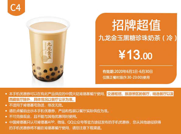 C4 九龙金玉黑糖珍珠奶茶(冷) 2020年6月凭肯德基优惠券13元