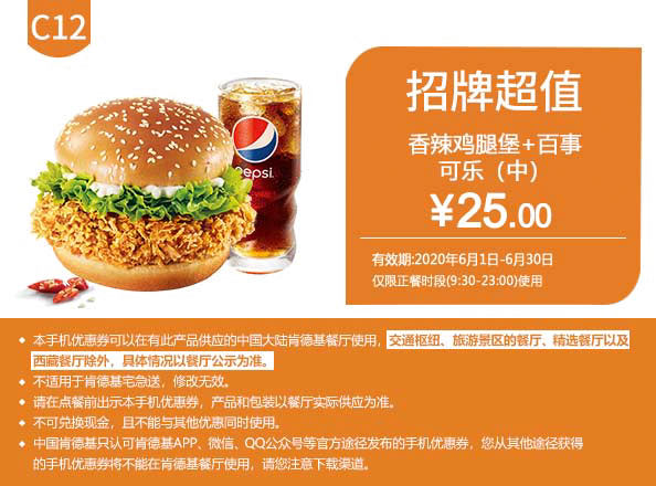 C12 香辣鸡腿堡+百事可乐(中) 2020年6月凭肯德基优惠券25元