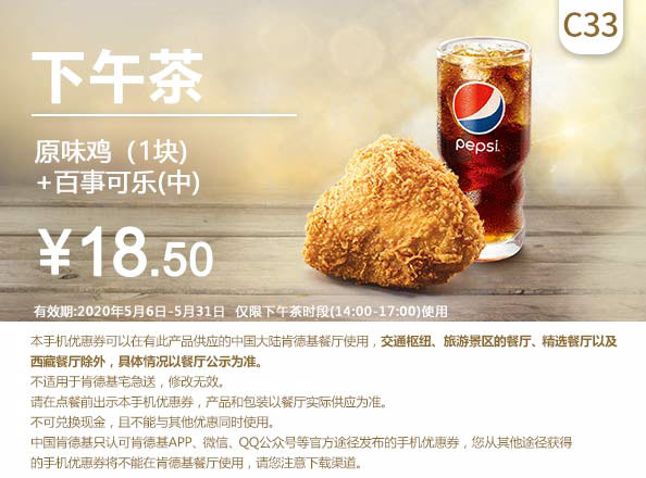 C33 下午茶 原味鸡1块+百事可乐(中) 2020年6月凭肯德基优惠券18.5元