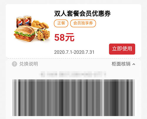 两人套餐 新奥尔良烤鸡腿堡+老北京鸡肉卷+黄金鸡块5块+百事可乐(中)2杯 2020年7月凭肯德基优惠券58元