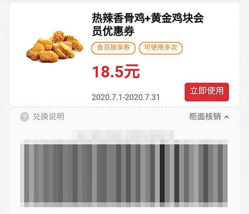 热辣香骨鸡+黄金鸡块 2020年7月凭肯德基优惠券18.5元