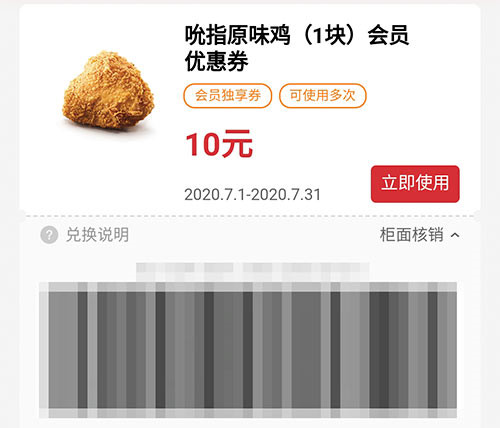 吮指原味鸡1块 2020年7月凭肯德基优惠券10元