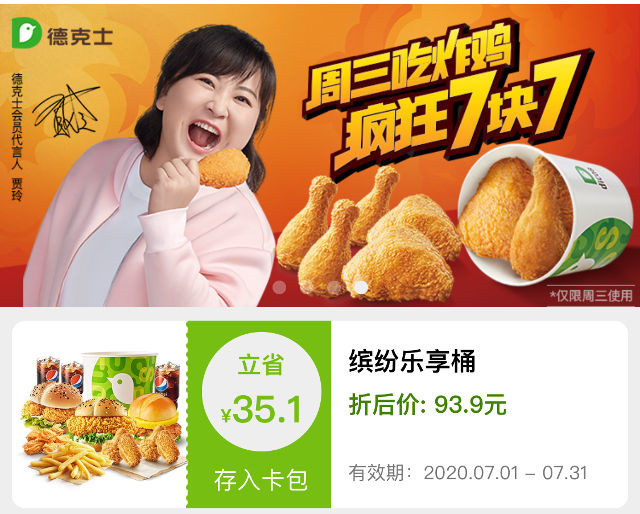 德克士桶餐优惠券2020年8月卡券领取,桶桶优惠价39元起