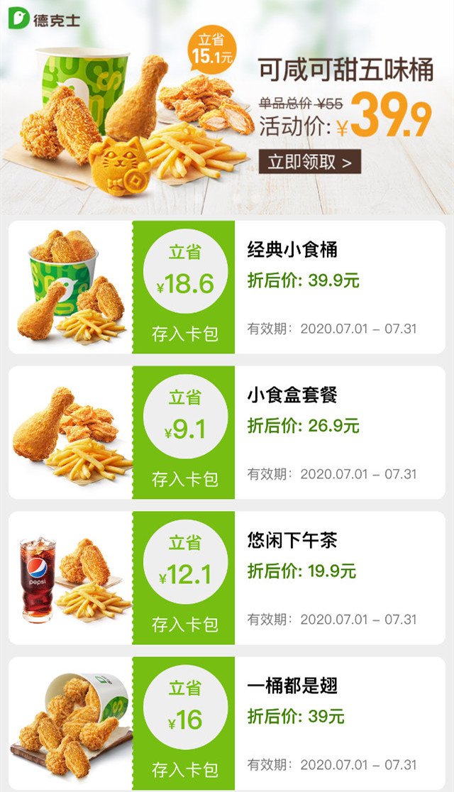 德克士桶餐优惠券2020年8月卡券领取,桶桶优惠价39元起