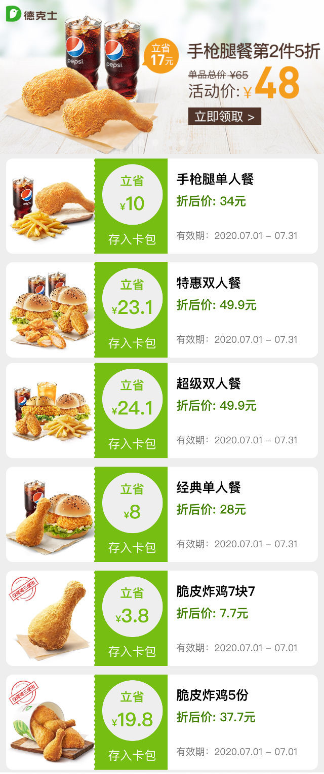 德克士套餐优惠券2020年7月单人套餐28元起,双人套餐49.9元起