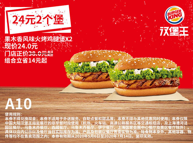 A10 果木香风味火烤鸡腿堡2个 2020年5月6月7月凭汉堡王优惠券24元