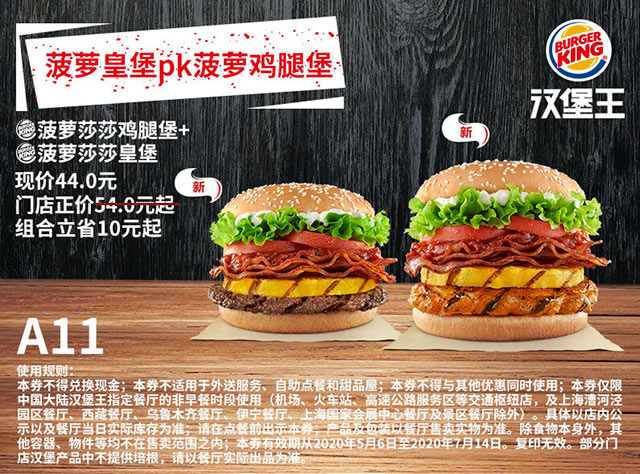 A11 菠萝莎莎鸡腿堡+菠萝莎莎皇堡 2020年5月6月7月凭汉堡王优惠券44元