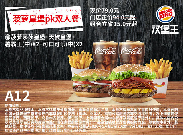 A12 菠萝皇堡PK双人餐 菠萝莎莎皇堡+天椒皇堡+薯霸王(中)2份+可口可乐(中)2杯 2020年5月6月7月凭汉堡王优惠券79元