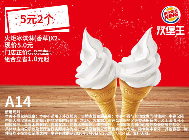 A14 火炬冰淇淋(香草)2个 2020年5月6月7月凭汉堡王优惠券5元
