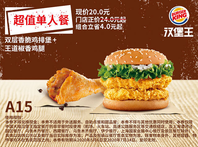 A15 双层香脆鸡排堡+王道椒香鸡腿 2020年5月6月7月凭汉堡王优惠券20元