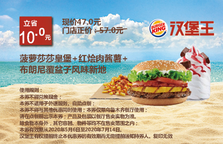 乌鲁木齐汉堡王 菠萝莎莎皇堡+红烩肉酱薯+布朗尼覆盆子风味新地 2020年6月7月凭优惠券47元