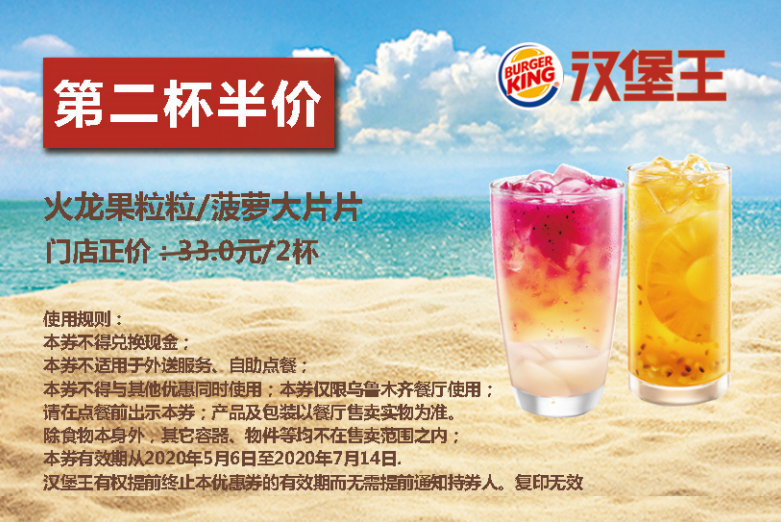 乌鲁木齐汉堡王 火龙果粒粒/菠萝大片片 2020年6月7月凭优惠券第2杯半价