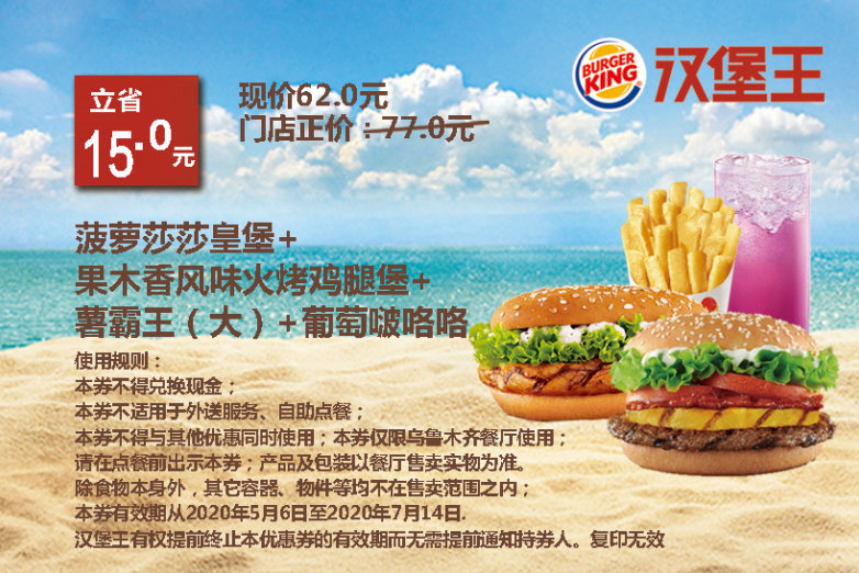 乌鲁木齐汉堡王 菠萝莎莎皇堡+果木香风味火烤鸡腿堡+薯霸王(大)+葡萄啵咯咯 2020年6月7月凭优惠券62元