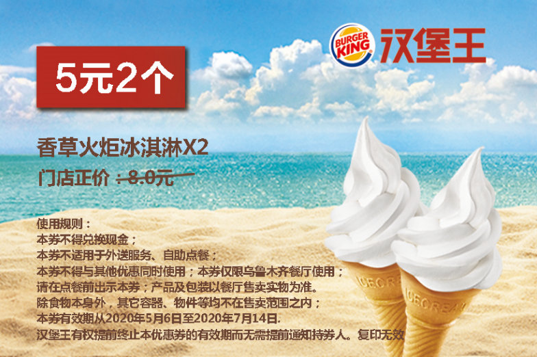 乌鲁木齐汉堡王 香草火炬冰淇淋2个 2020年6月7月凭优惠券5元