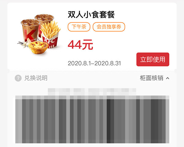 双人小食套餐 中杯拿铁1杯+中杯风味拿铁1杯+小薯条+葡式蛋挞 2020年8月凭肯德基优惠券44元