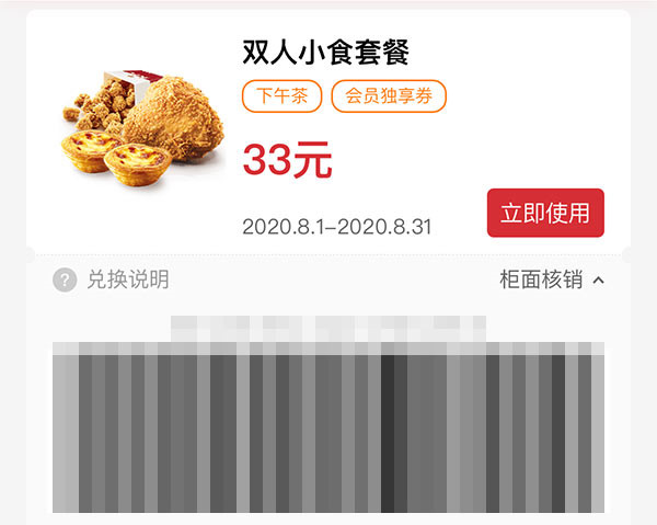 双人小食餐 炸鸡+鸡米花+蛋挞 2020年8月凭肯德基优惠券33元