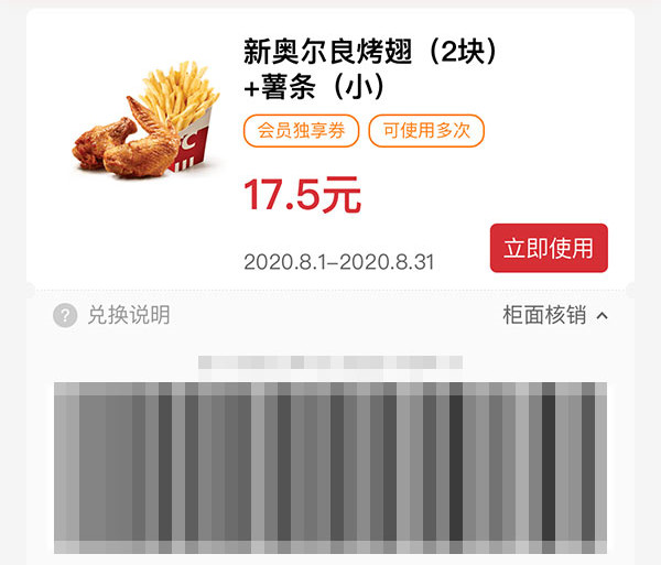 新奥尔良烤翅2块+薯条(小) 2020年8月凭肯德基优惠券17.5元