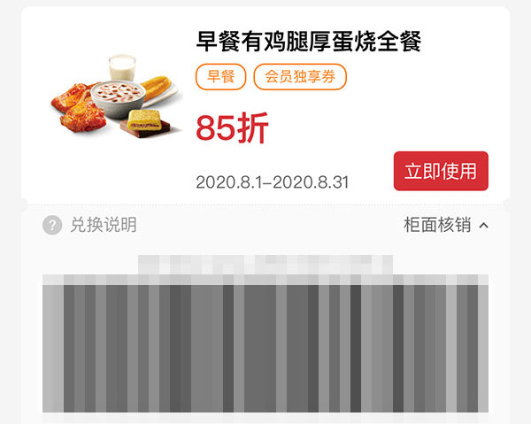早餐 有鸡腿厚蛋烧全餐 2020年8月凭肯德基优惠券85折